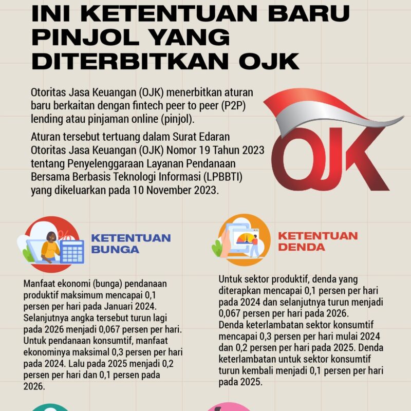 OJK menurunkan bunga pinjol menjadi 0,1% hingga 0,3% per hari. Selain itu, denda keterlambatan pada 2026 hanya 0,1% per hari.