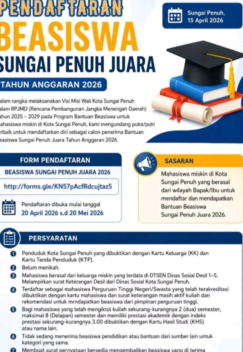 SUNGAIPENUH,JS- Pemerintah Kota Sungai Penuh kembali menghadirkan program unggulan di sektor pendidikan. Tahun ini, pemerintah resmi membuka pendaftaran Beasiswa Sungai Penuh Juara 2026 untuk membantu mahasiswa dari keluarga kurang mampu agar tetap melanjutkan kuliah.