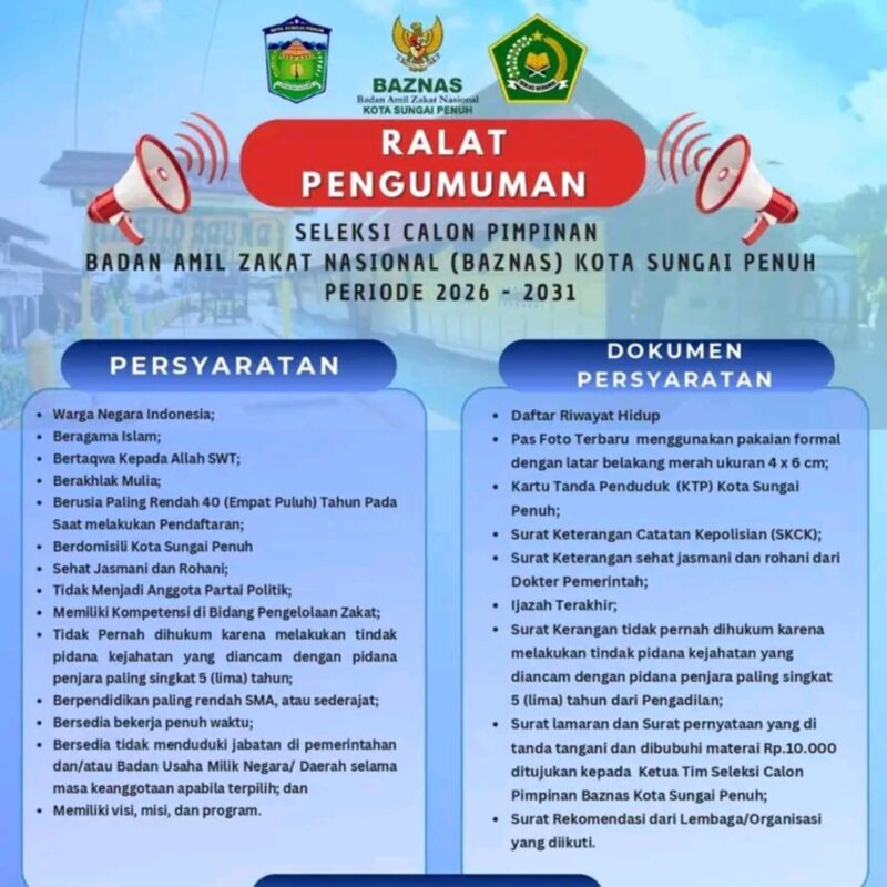 SUNGAIPENUH,JS- Kabar penting bagi Anda yang ingin berkarier di lembaga keuangan syariah nasional. Badan Amil Zakat Nasional (BAZNAS) Kota Sungai Penuh resmi membuka seleksi calon pimpinan untuk periode 2026–2031.