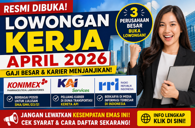 Lowongan kerja terbaru April 2026 membuka peluang besar bagi pencari kerja di Indonesia. Rekrutmen dari Konimex, KAI Services, dan RRI menghadirkan banyak pilihan karier dengan prospek menjanjikan.